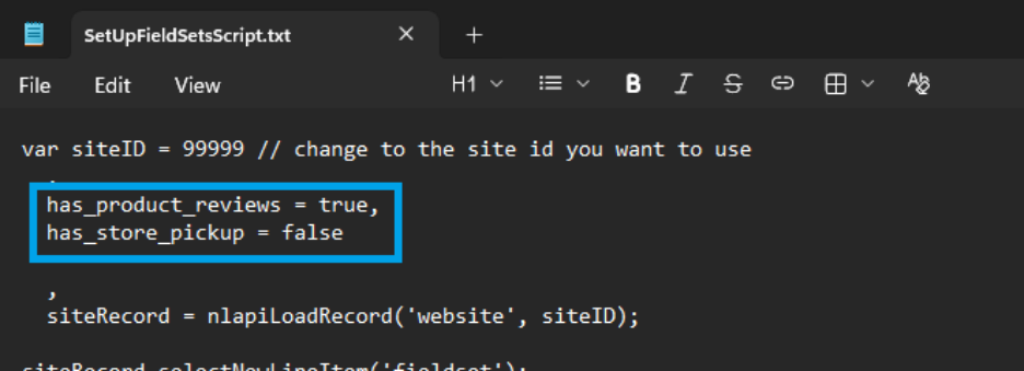 1. 添付されたテキスト・ファイルを開き、フィールド・セットを追加するサイドIDでsiteID変数を編集します。