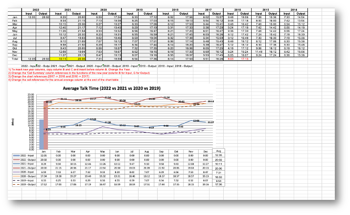 Canon Canada's customer service KPIs include "Time to response," "Time on a service call," and other time-based measurements as currently skillfully summarized within an Excel document, as pictured below. In order for executives and customer service team leads to evaluate their employees' and department's success, these must be displayed in Excel tables as Minutes and Seconds ("mm:ss"), and be aggregated, categorized, and displayed within various charts.
