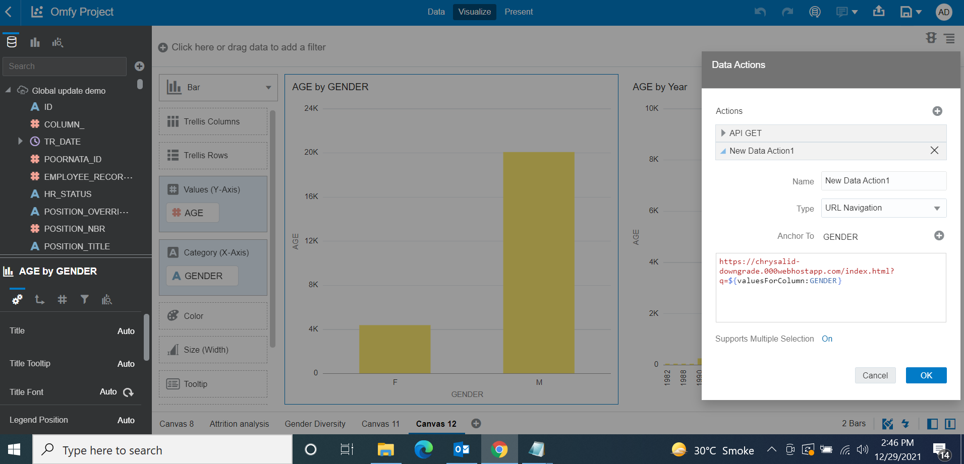 As we have created AGE by GENDER graph for an enterprise, we are using URL Navigation data action to get the graph inside a web page. We are using the webhost app's URL for creation of the URL Navigation data action named New Data Action1. We have tried anchoring with/without the data to the respective parameter (column) named GENDER but still as we pass the values of GENDER as M or F or M,F the graphs wont change dynamically, it will display the graph as it is inside OAC.