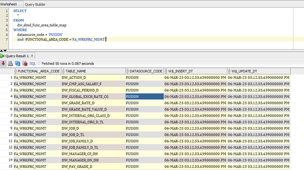 additionally DW_DMD_FUNC_AREA_TABLE_MAP can help you identify the tables to Functional Area example