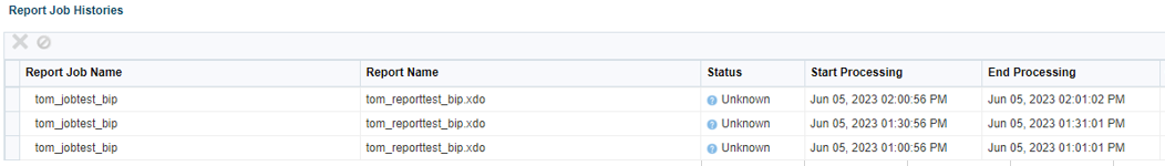 We have a DR solution where we use two OAS servers in an active active set up. In order to keep the environments in sync, we have a scheduled job that exports the ssi bar from primary and imports that same ssi bar into secondary. After we perform a role swap, the environment that is being imported into / overwritten loses its Bi Publisher job history and changes to status: "unknown" as observed in the screenshot below.