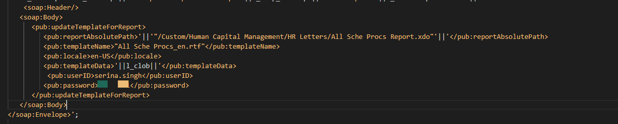 <env:Envelope xmlns:env="http://www.w3.org/2003/05/soap-envelope"><env:Header/><env:Body><env:Fault><env:Code xmlns:env="http://www.w3.org/2003/05/soap-envelope"><env:Value>env:Receiver</env:Value></env:Code><env:Reason><env:Text xml:lang="en-US">PublicReportService::executeUpdateTemplateForReport Failure: user has no access to report["/Custom/Human Capital Management/HR Letters/All Sche Procs Report.xdo"] due to [Ljava.lang.StackTraceElement;@7d3a0abb</env:Text></env:Reason><env:Detail/></env:Fault></env:Body></env:Envelope>