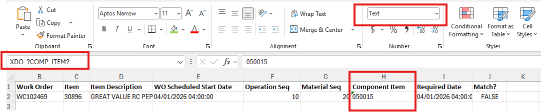 To resolve the leading zeros issue in the Excel template, format the column(s) as Text and enter the data values for the fields where the XML elements are referenced, as shown below.