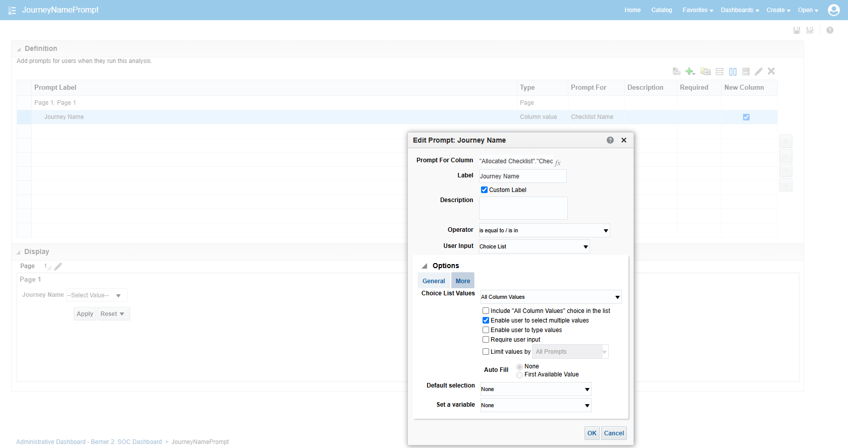 These are my prompt settings, I'm using the Allocated Checklist.Checklist Name field in the Workforce Management - Checklist Real Time subject area.