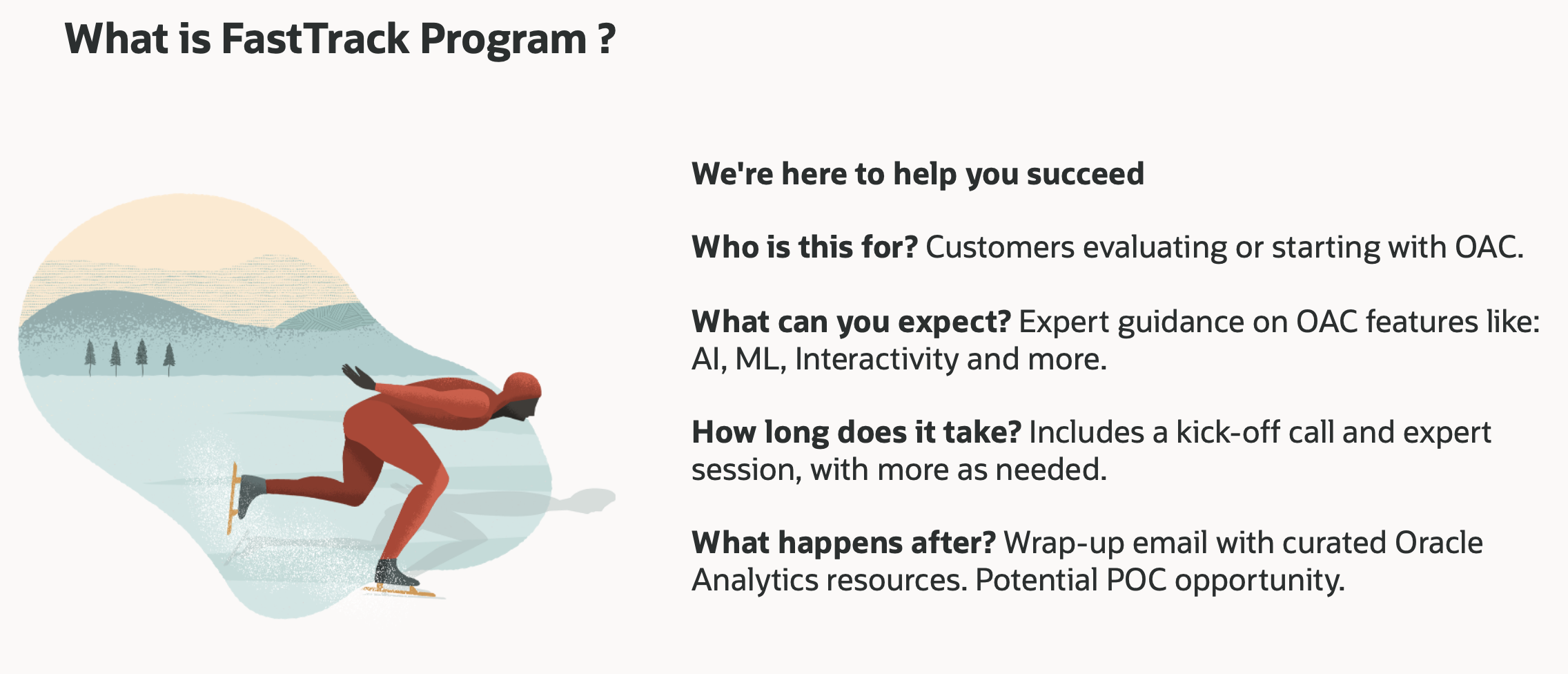 Oracle Analytics Cloud customers are invited to participate in our complimentary FastTrack Program – expert guidance to help you achieve your analytics goals faster.