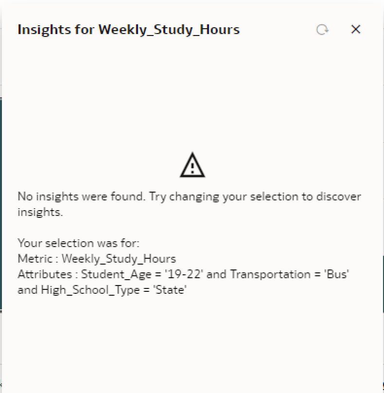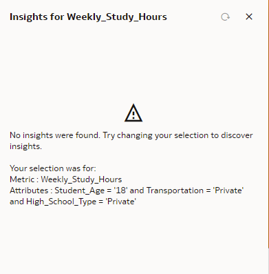 - This led to the below error citing 'No insights were found.' And prompted to 'Try changing selection to discover insights'.