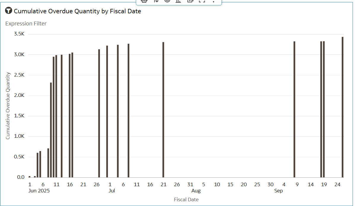 We Created it using subject area and calculated overdue based on formula. But fiscal date is triggering only for PO creation date and the bar will decrease once POs are received —> So if something is received on evening of 30th Sep and once data refreshes, on 1 Oct, the bar of 30th Sep also decreases. Whereas as per requirement, 30th Bar should stay as it, changes should only be in 1st Oct data. So, it's live data and we need snapshot of historical data as well.