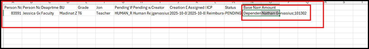 The full row is repeated under Parent group: Txnh and the highlighted 2 columns : Base Name and Amount, repeated for group : Xmlcache Detals