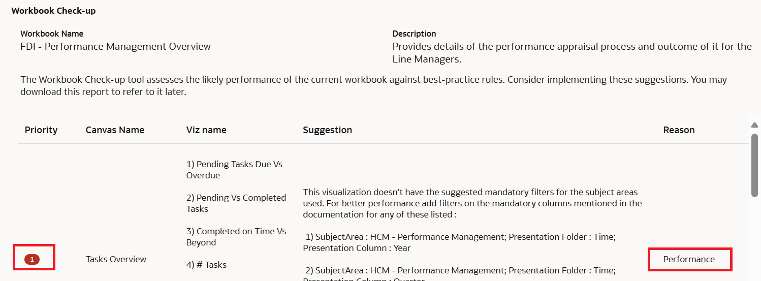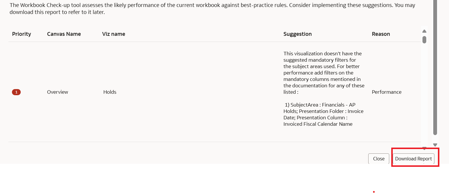 As organizations leverage FDI's advanced analytics capabilities, ensuring optimal performance becomes critical—especially when designing workbooks. Workbook authors may encounter slow response times due to inefficiently designed workbooks. To promote best practices, improve performance, and reduce delays, Fusion Data Intelligence (25R3) now includes a workbook check-up tool.This tool assesses the workbook performance based on best practice guidelines and helps standardize the workbook design criteria that should be followed organization wide. It is highly recommended to run the tool before deploying reports to users.