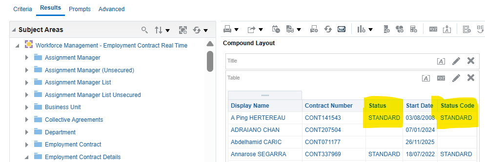 we are creating an OTBI report with the Employment Contracts Real Time subject area and we have seen that it is available the fields Status and Status code, but what do they refer to exactly in the application? Because, if we look at the Employment Contracts page there is no Status field available, even from Visual Builder there is no similar field that can be made visible in the app. Only value available for the Status field is "STANDARD". Any suggestions?