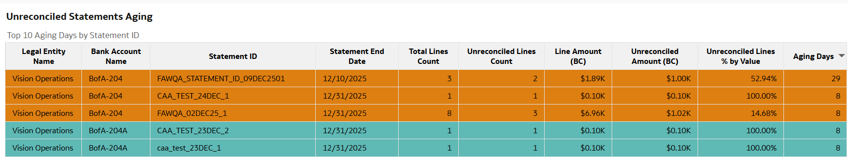 - What is the aging analysis of bank statements, and what percentage of line amounts remain unreconciled by statement?
