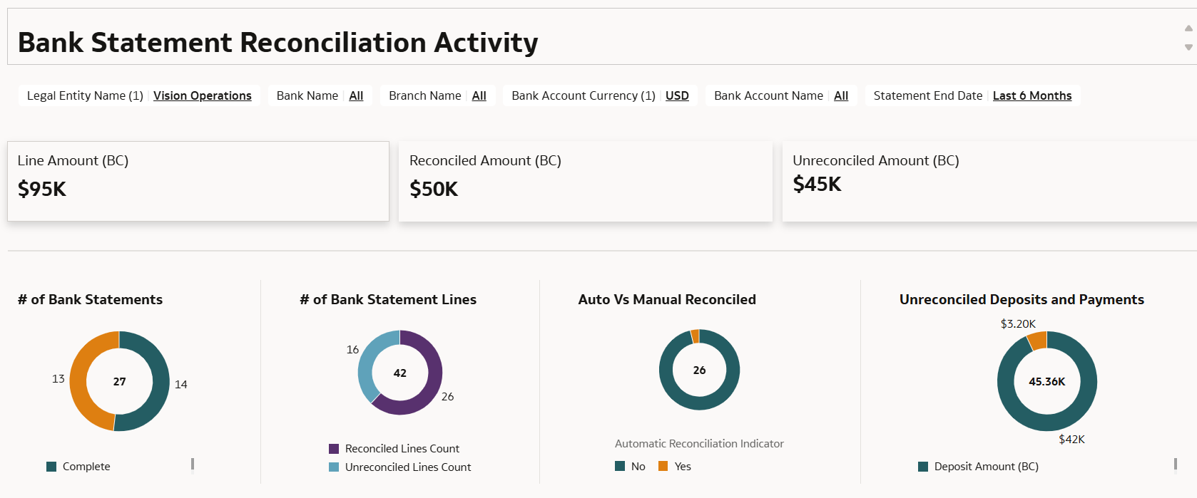 We are excited to present a ready to use DV dashboard based on the Financials Cash Management Bank Statement subject area that was released as a preview feature in 25R3. This visualization empowers cash managers to quickly identify and analyze unreconciled bank statements, segmented by Legal Entity, Bank Account, and Currency. This provides comprehensive visibility into the progress and status of bank statement processing and reconciliation.