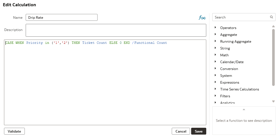 When you're creating a calculation in a workbook, it gives you the option to add a description of the metric. What would be nice is if there was an AI Assistant that is trained to translate OAC calculations to natural language for better glossary type definitions. Add a button in the Description dialog that says, "Write with assistant" or something like that and have it write the description for you. For example, I have a calculation that says: