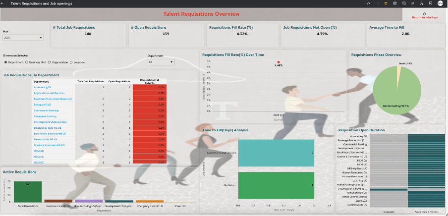 In this post, we are sharing a reusable workbook that covers Talent Requisitions and Job Openings, reflecting your organization’s ongoing staffing needs and hiring activity. This workbook provides comprehensive insights into key metrics—including total requisitions, total openings, vacancy fill rate, hire-to-rate, and offer extension rate—in addition to fill rates and time-to-hire. Data can be analyzed by department, business unit, location, or organization level. Monitoring these trends supports timely decision-making, effective resource planning, and ongoing workforce alignment.