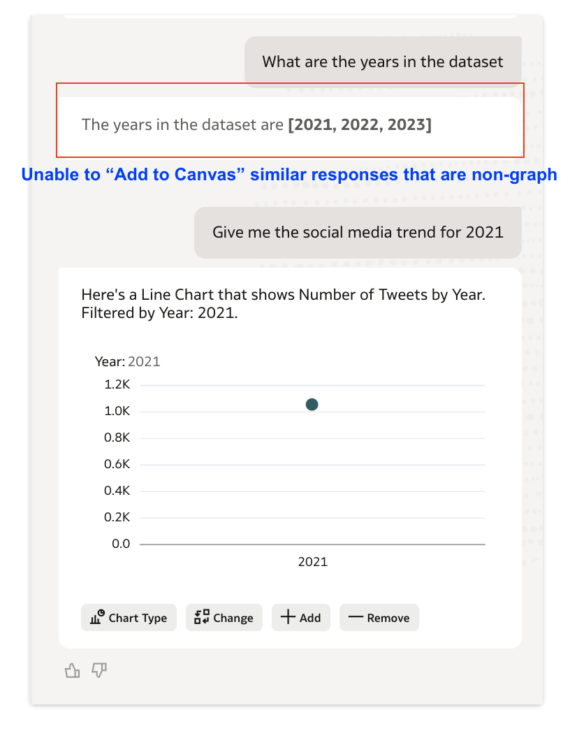 From November 2025 release version onwards, it is observed that the AI Assistant responses in the form of numeric values or text descriptions - are not having the provision to add to the canvas. This ability seems to be confined to only graphs generated.