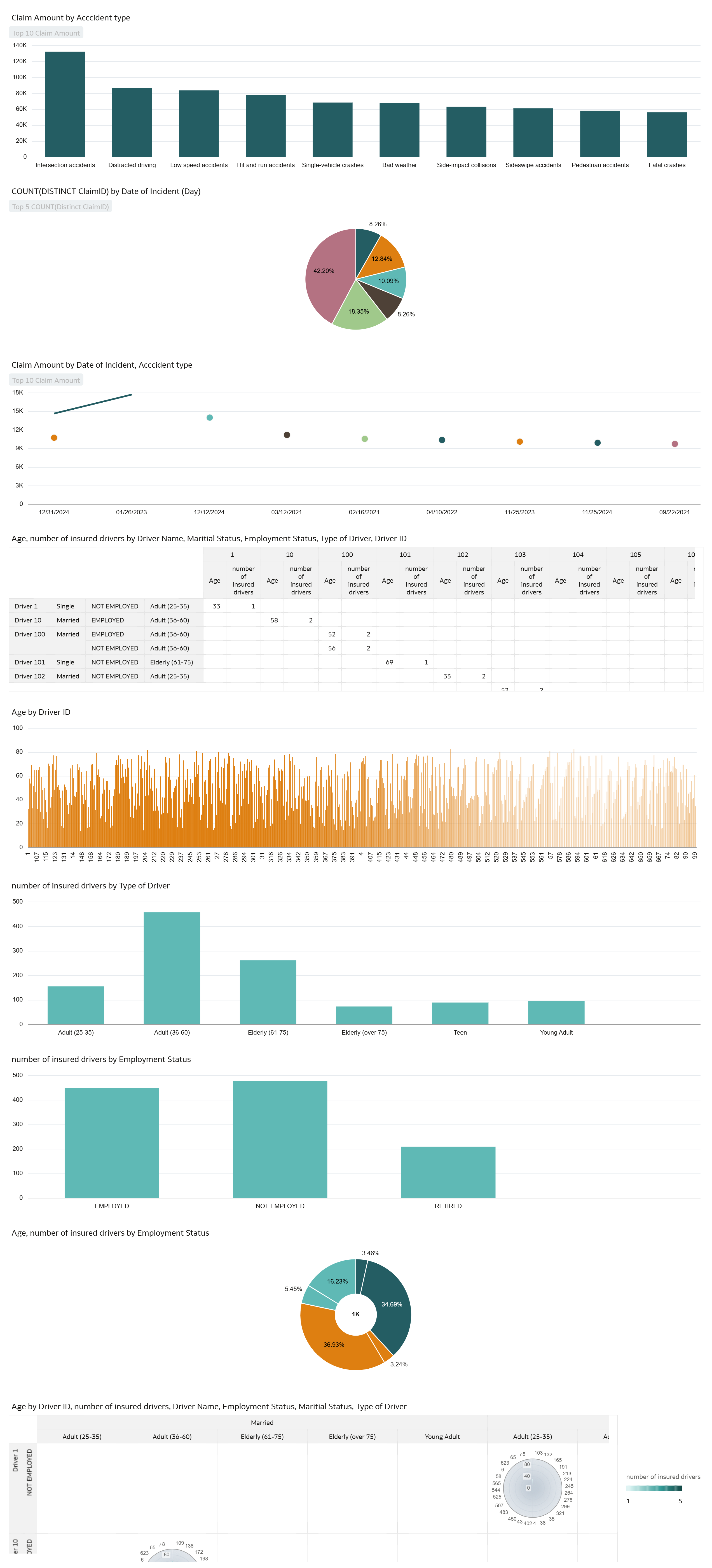 My visualization is about how we can view insurance claims data and identify which age groups are filing more insurance claims, what is their employment status. It also provides a very interactive visualization in terms of sharing what are different accident types for which claims are being filed.