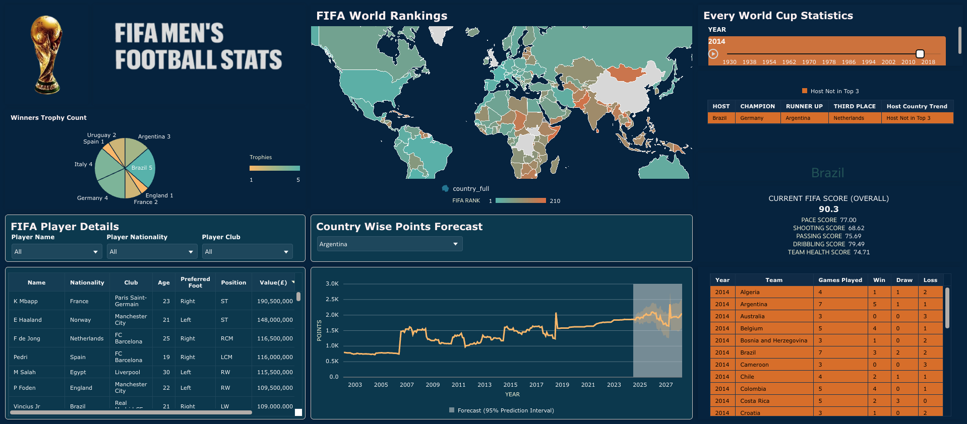 This visualization brings together historical World Cup performance, current FIFA rankings, player-level attributes, and predictive analytics into a single interactive dashboard. It addresses questions such as: