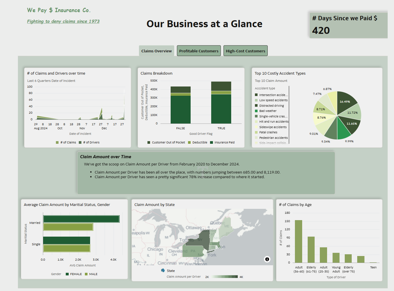 Employees who work at the fictional company We Pay $ Insurance Co are the audience. The dashboard is designed to provide an overview of claims, a picture of who the good customers are, and which customers are costing the company money.