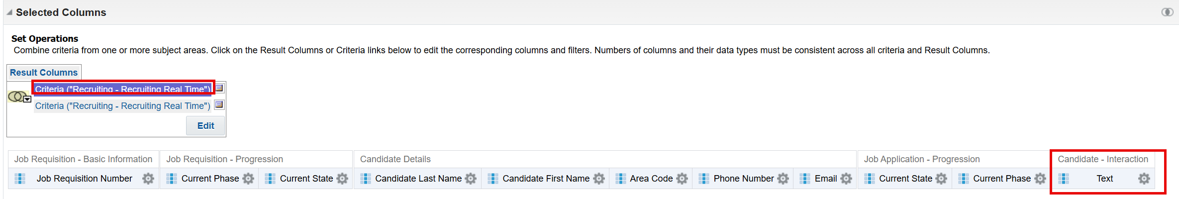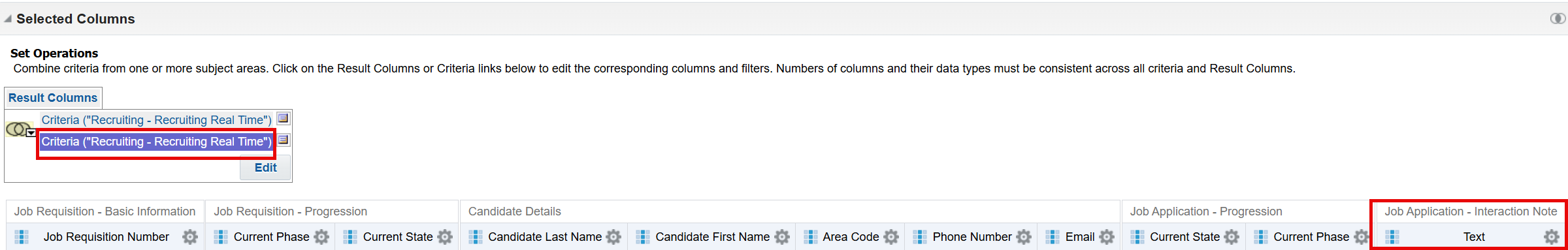 I attempted to use a UNION through Set Operations (https://docs.oracle.com/en/cloud/saas/otbi/otbi-user/advanced-techniques-combine-columns-display-data-differently.html). In the first analysis (the primary one), I included "Text" column from "Candidate – Interactions" folder: