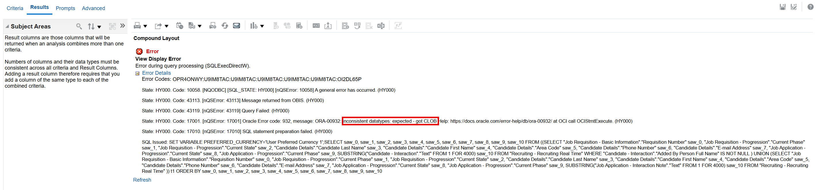 However, when I navigate to the Results tab, the analysis returns the following error: "inconsistent datatypes: expected - got CLOB"