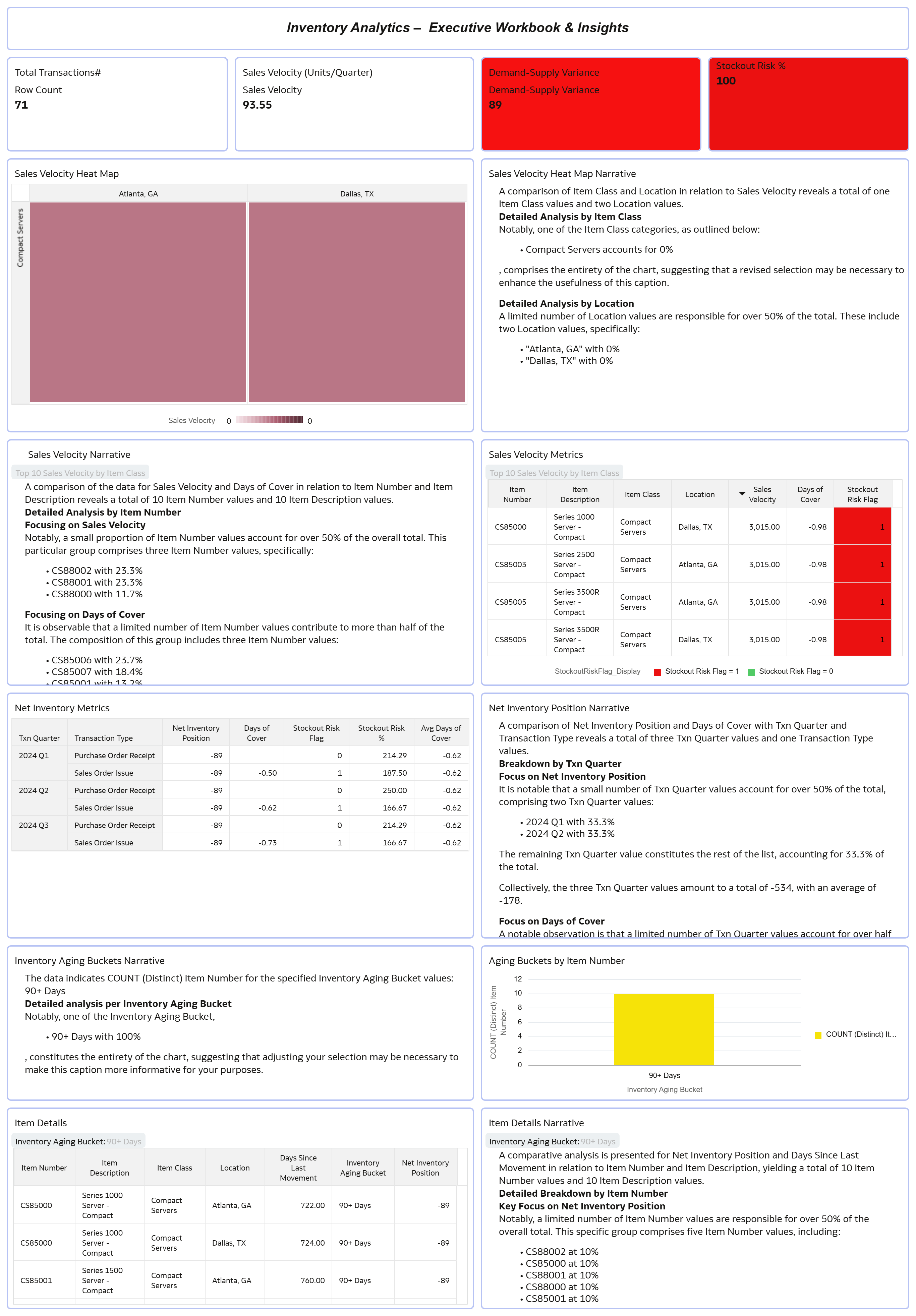 This is a comprehensive and well-structured executive dashboard. The inclusion of narrative panels adds strong executive context.