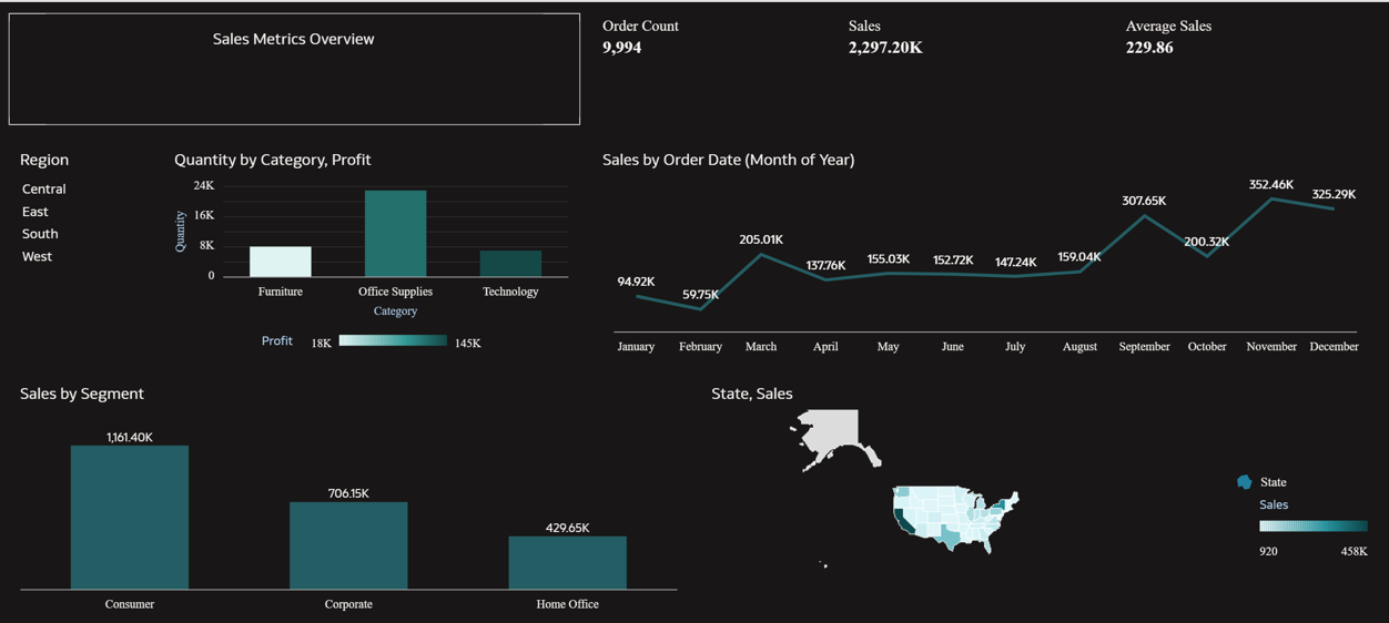 4. Regional & State Sales MapA map visualization showing sales geographically, which lets the user to spot where sales are strongest or weakest across the country. Filters on region (Central, East, South, West) help drill into specific areas.