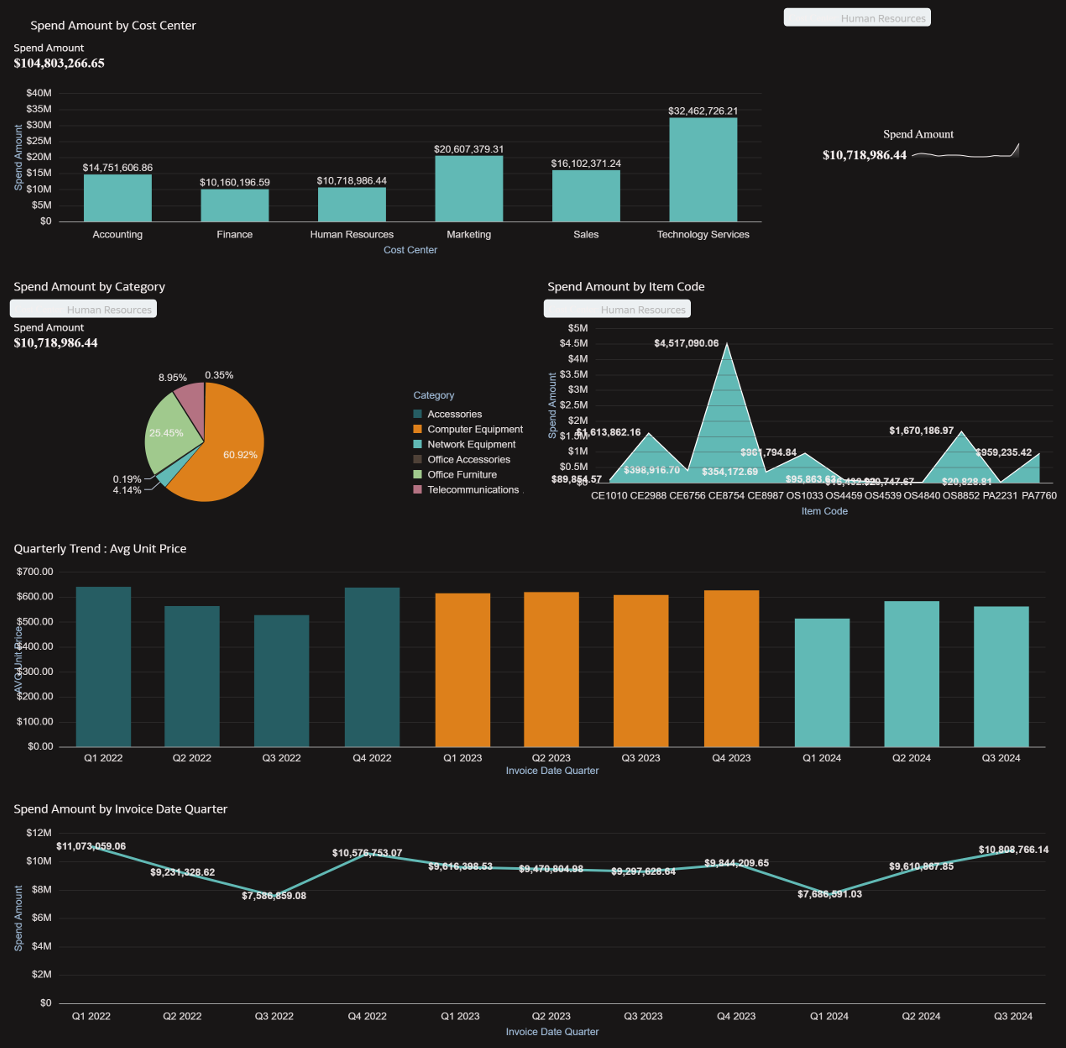 This Analysis shows clear picture on Total spend and Average based on Category , Cost center. This shows Quarterly and yearly trend of spend to better understand spend growth.