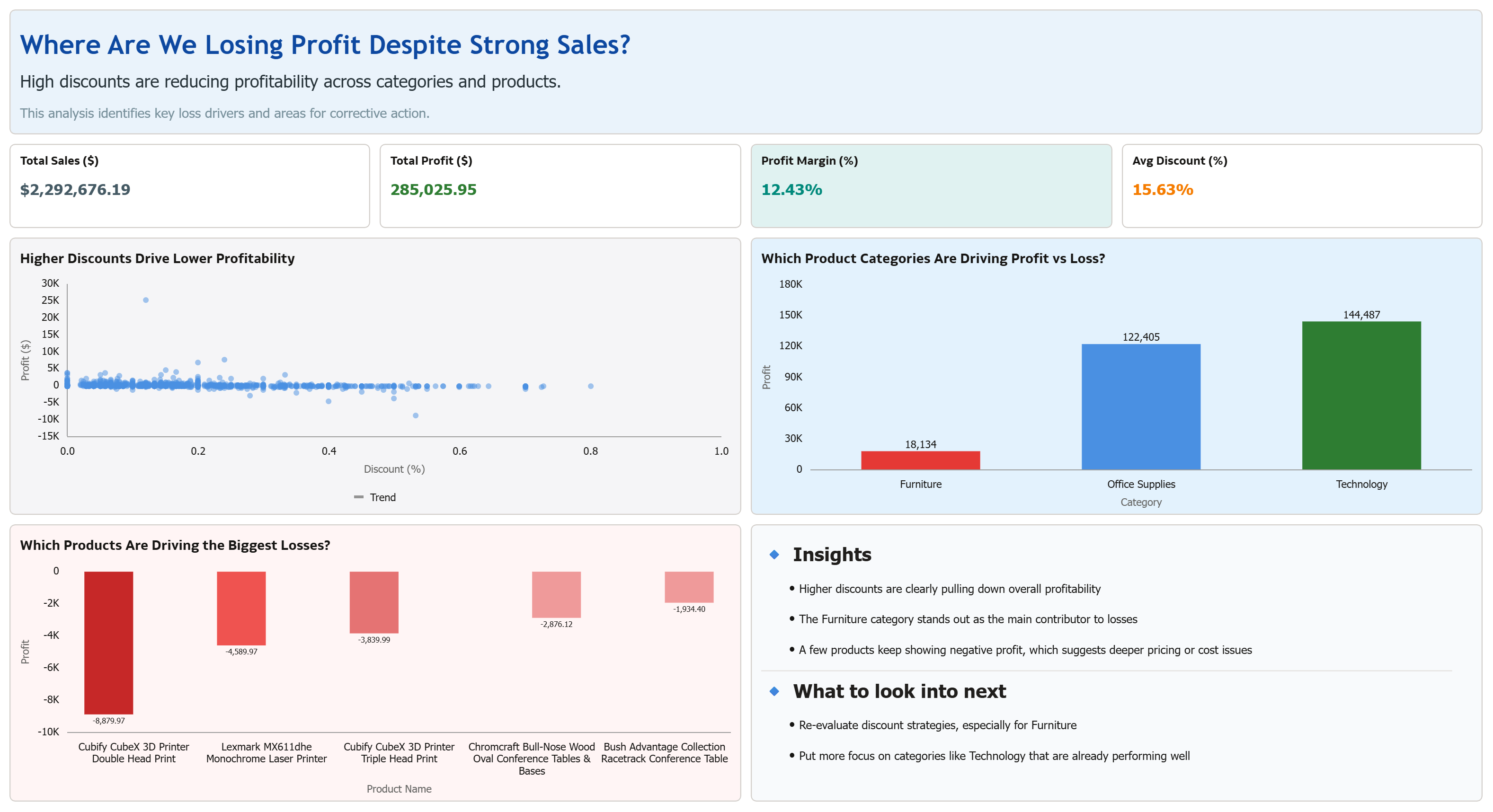This visualization focuses on understanding why strong sales are not translating into expected profit. It highlights the impact of discounting across categories and identifies specific products and segments where profitability is negatively affected. The goal is to uncover areas where revenue growth does not align with profit performance.