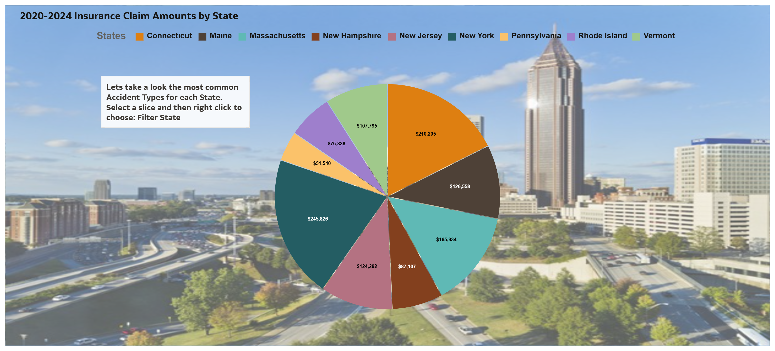 - I created an aggregate visual of insurance claim amounts by state and subseqiuently did a drill down to look at the most common accident types by weekday for each given state.