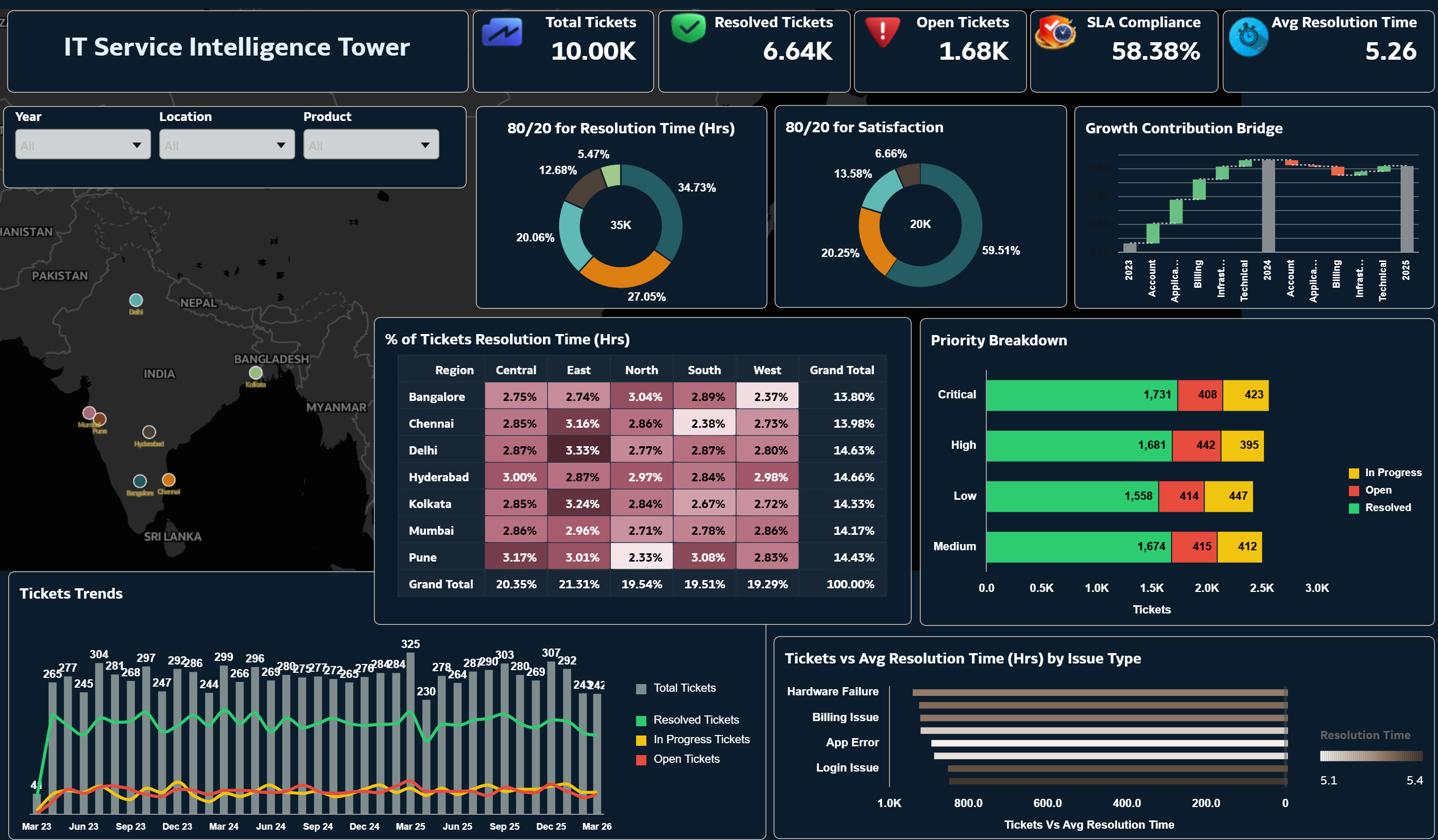 I used a service management dataset with around 10,000 records covering the last 3 years. It includes ticket details like issue type, priority, status, SLA, resolution time, location, category, and satisfaction. - How did you analyze or prepare the data?