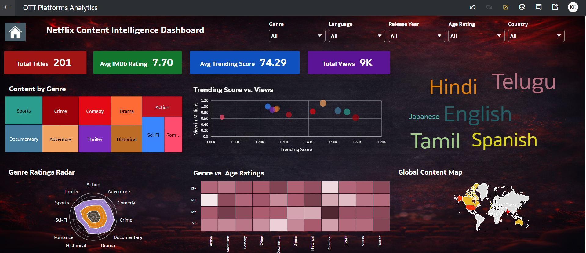I standardized key attributes such as genre, language, and age ratings and ensured all measures like views, ratings, and scores were in numeric formats. I created calculated KPIs such as Avg IMDb Rating, Trending Score, and Total Views directly in OAC. Filters and visual interactions were applied to enable dynamic cross-platform and multi-dimensional analysis.
