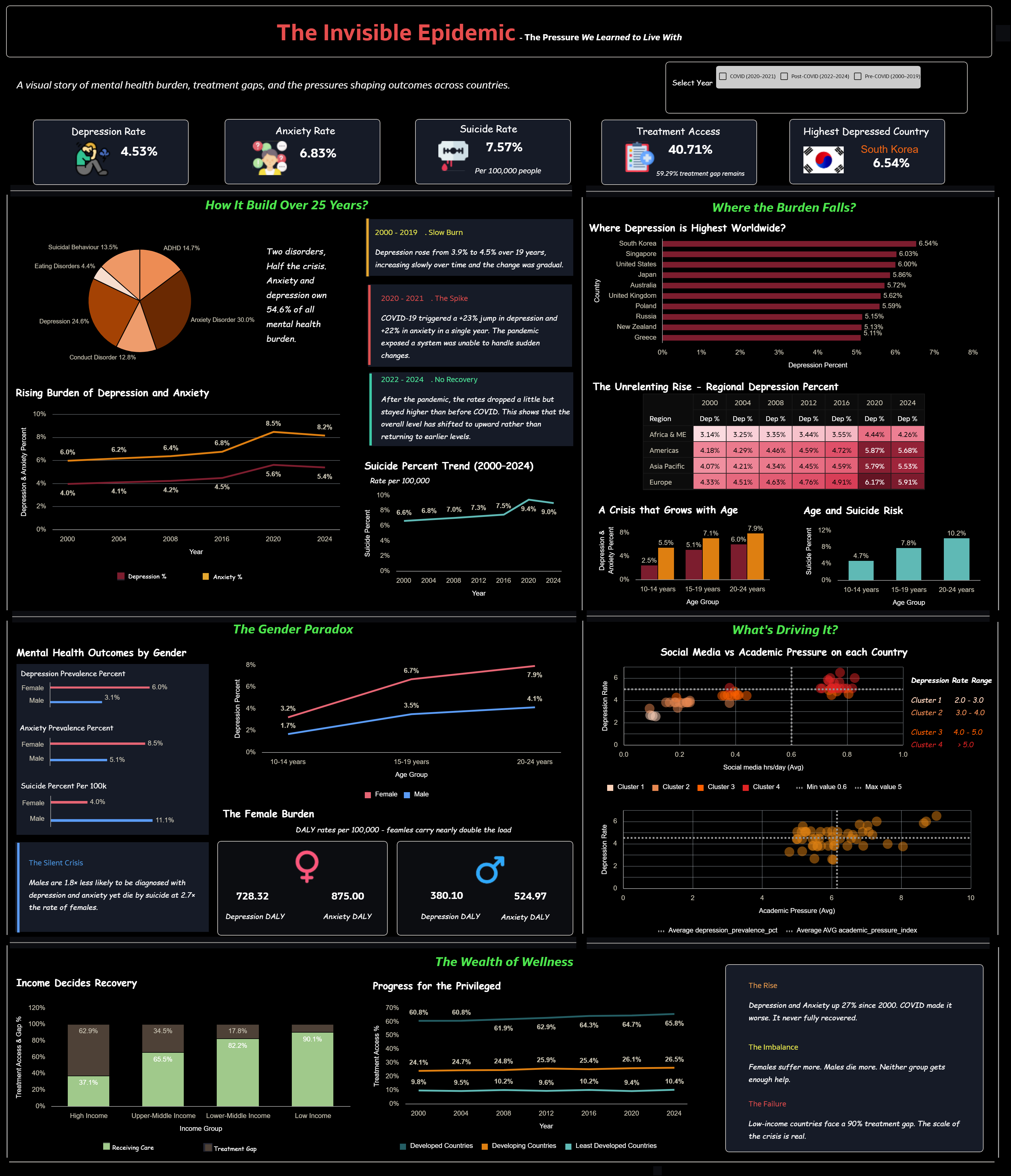 The dashboard tells a clear story of how mental health burden has grown over time, where it is most concentrated, and who is most affected. It highlights geographic and age-based burden, the gender gap in outcomes, the influence of social and academic pressures, and the deep inequality in treatment access. Overall, it shows that the crisis is not only rising, but that the global response remains inadequate and uneven.