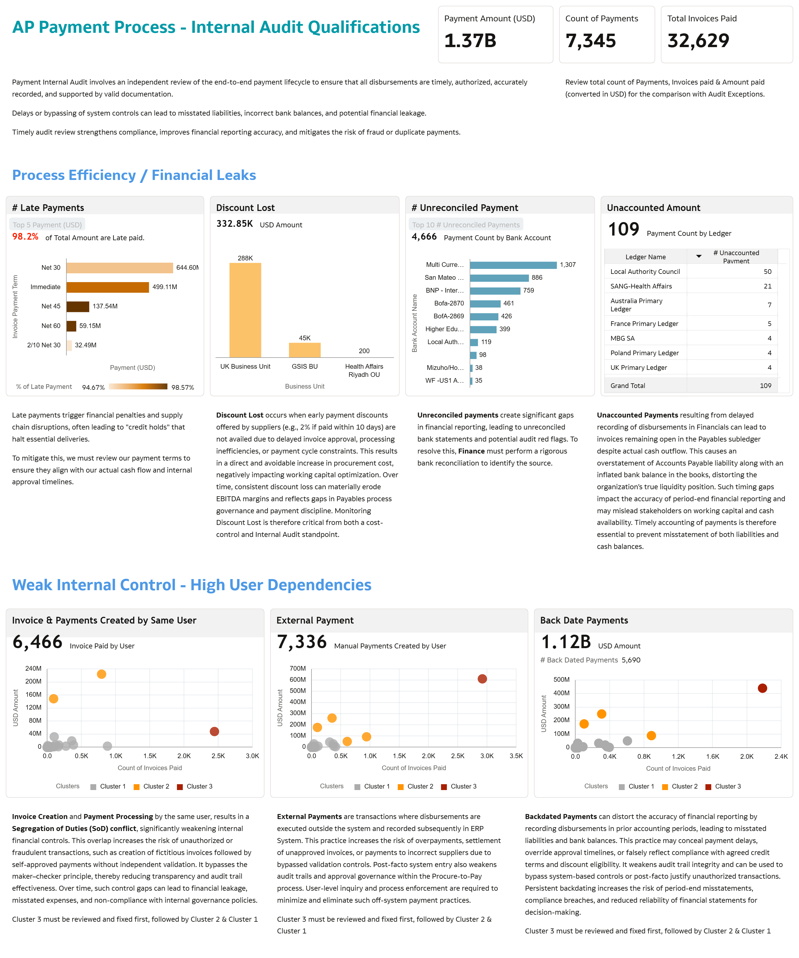 The primary purpose of the dashboard is to help the business proactively monitor exceptions, understand the root causes, and take timely corrective actions. By surfacing audit‑relevant insights—such as Late payments, discount Lost, Unreconciled Payment, Invoice & Payments created by same User — the visualization supports stronger financial governance and improves the overall quality of the disbursement process.