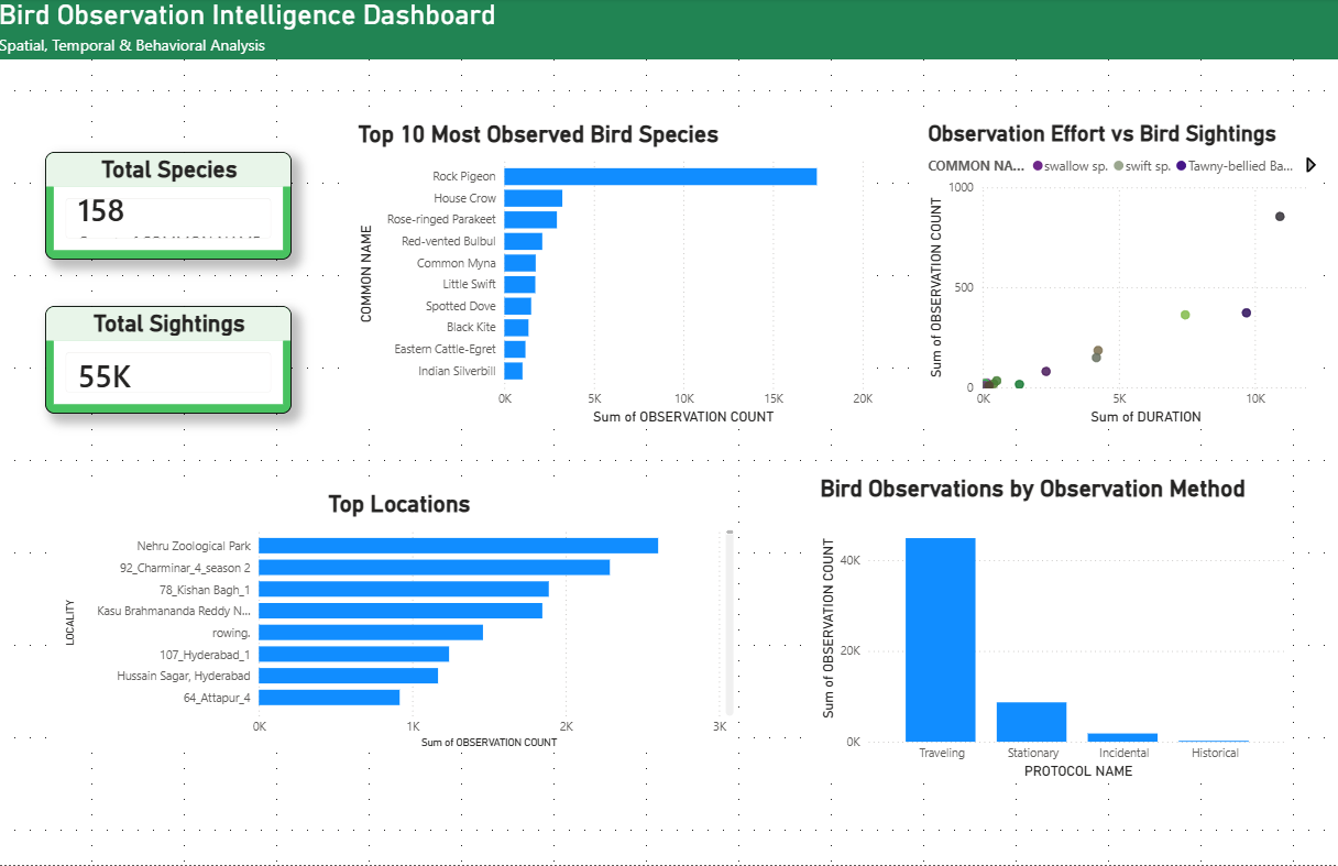 This dashboard analyzes bird observation data collected from HBA (Hyderabad Birding Atlas) to uncover meaningful patterns in species distribution, geographic activity, and observation methods. It highlights the most frequently observed bird species, identifies key locations with high observation activity, and examines how different observation protocols such as stationary, traveling, and incidental methods influence data collection. In addition, it explores the relationship between observation effort, measured through duration, and the number of sightings recorded, providing deeper insights into biodiversity patterns and birdwatching behavior.