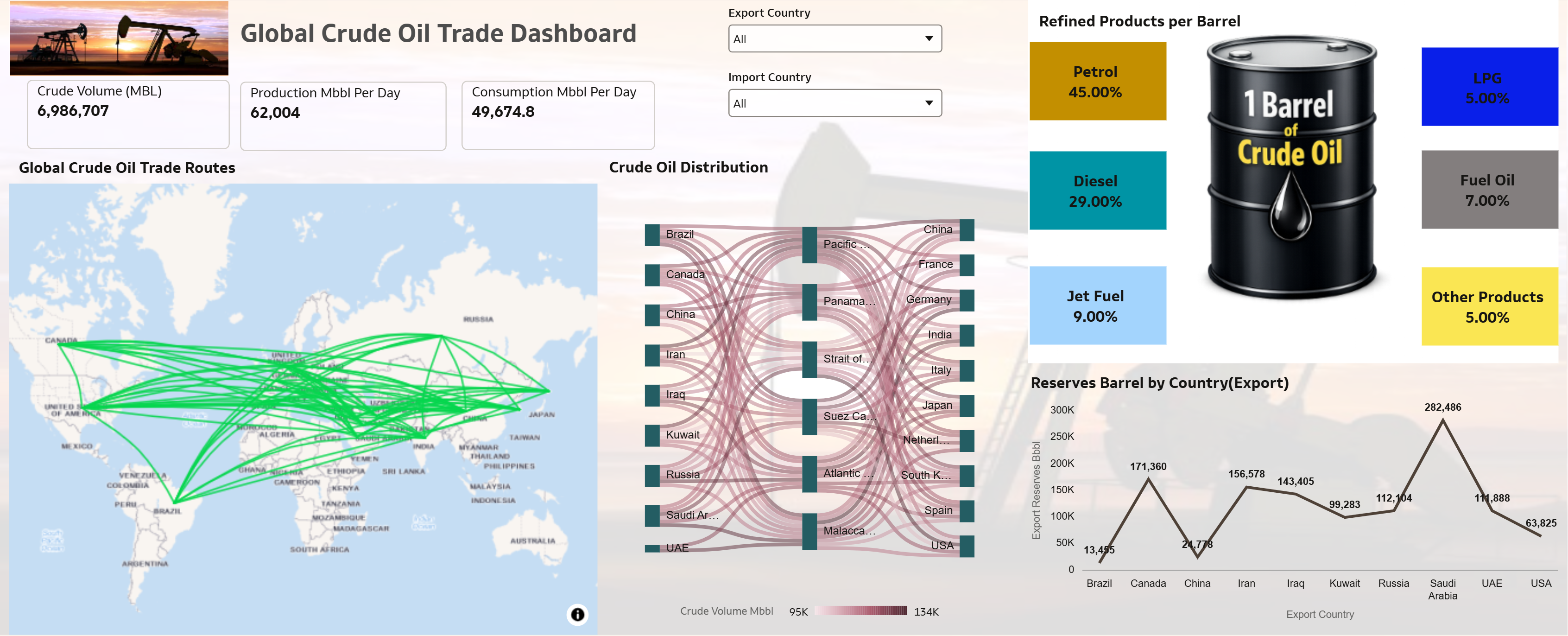I used a global crude oil trade dataset that includes export and import countries, trade routes, crude volume (in MBbl), and product breakdown such as petrol, diesel, jet fuel, LPG, and others. It also contains production, consumption, and reserves data for exporting countries. To enhance visualization, I generated additional latitude and longitude data for mapping trade routes. This dataset provides a complete view of global oil movement and distribution.