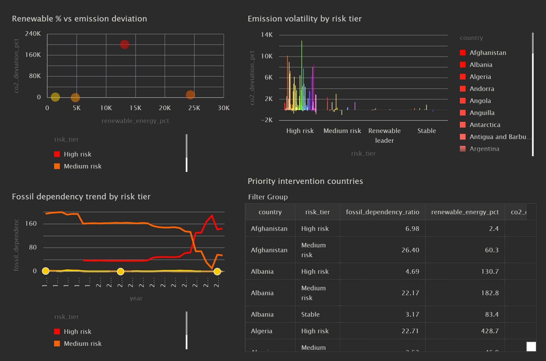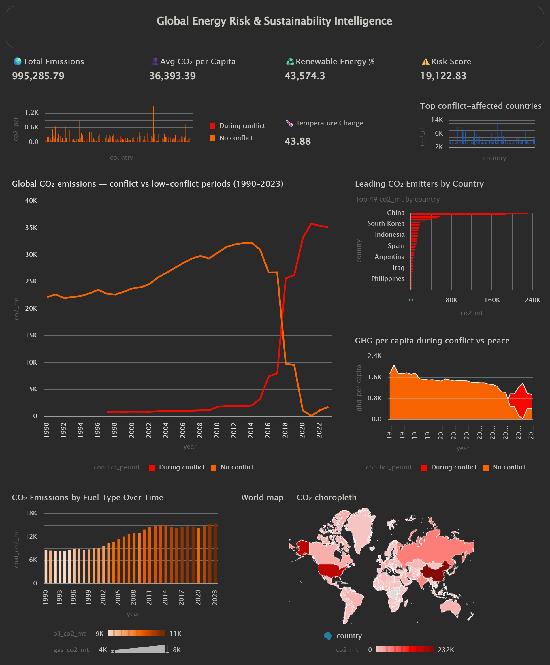 The dashboard focuses on climate, energy, and geopolitical analysis. It answers questions such as: