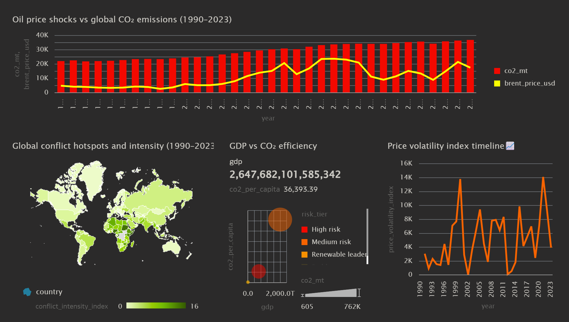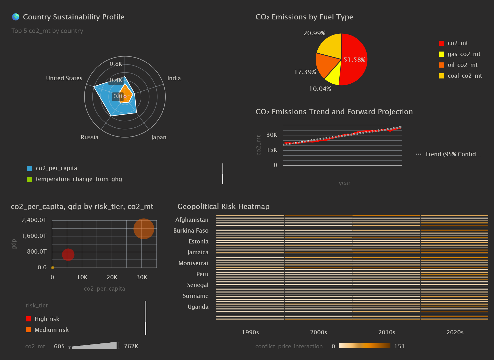 The visualizations provide a comprehensive overview, helping stakeholders understand environmental impact, energy trends, and geopolitical risks in one platform.