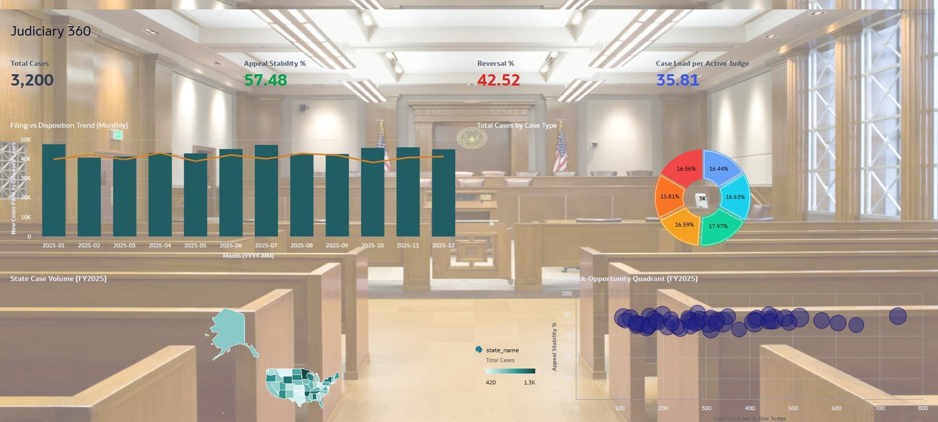 The visualization shows judicial decision quality and court capacity across U.S. states. It helps identify where workload is high, where appeal outcomes are less stable, and where resource planning is needed to improve consistency and efficiency.