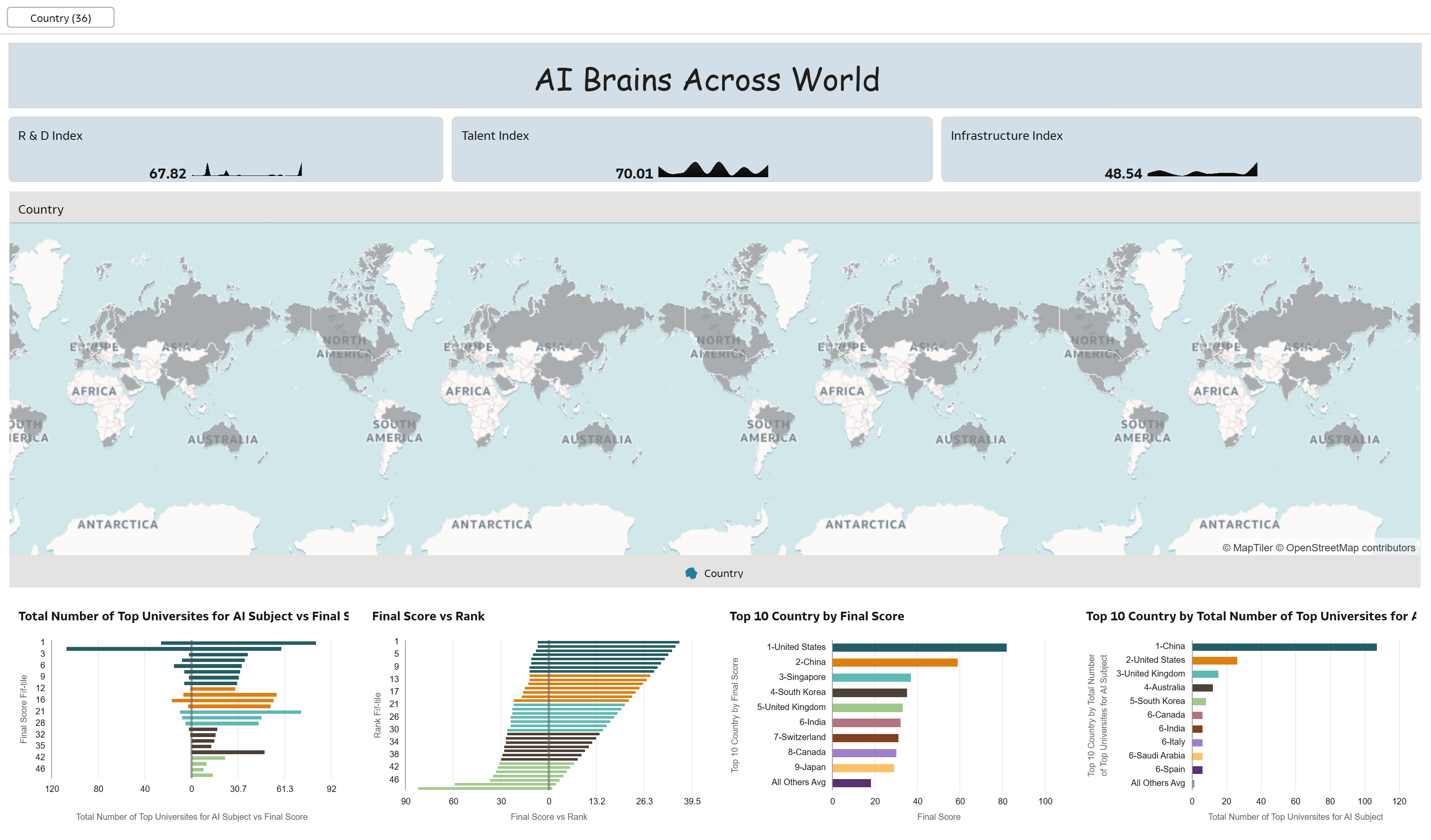 The “AI Brains Across World” dashboard provides a comprehensive overview of global artificial intelligence capabilities by comparing countries across three key dimensions: R&D Index, Talent Index, and Infrastructure Index. These indicators collectively represent a nation’s strength in AI research, availability of skilled professionals, and technological readiness.