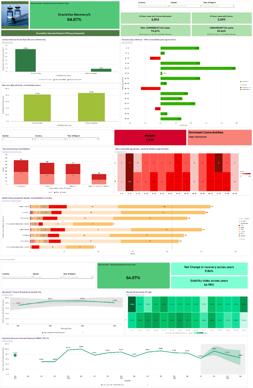 This visualization is a population‑level outcomes intelligence dashboard designed to evaluate the effectiveness, risk concentration, and stability of the OracleVax vaccine across demographics, comorbidities, geography, and time.