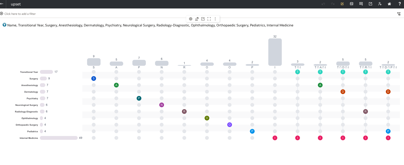 - The UpSet chart reveals which specialties students commonly apply to together, the size of each intersection, and how those intersections compare to individual specialty totals. It addresses scheduling, resource planning, and advising questions such as: