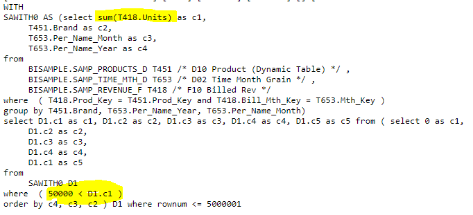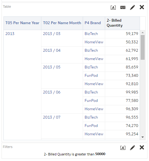 The filter on the "2- Billed Quantity" is understood as being a filter on an aggregated measure, and the tool should translate correctly into a post-aggregation query.