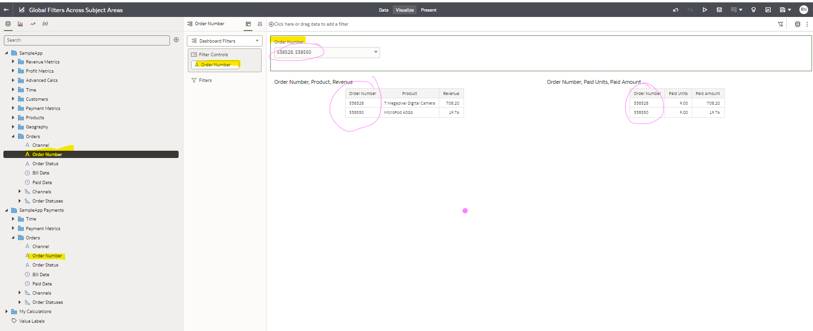 Looking to show these two subject areas within one canvas with a shared global filter. Currently only able to achieve this through the classic view dashboard, is this achievable in the Data Visualization?