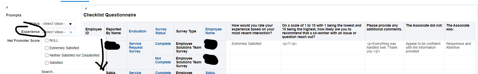 The requirement is to add Responses from Q1 and Q2 as Prompts. Example: The prompt would sy pick all the records where Response to Q1 was Extremely Satisfied/Satisfied.