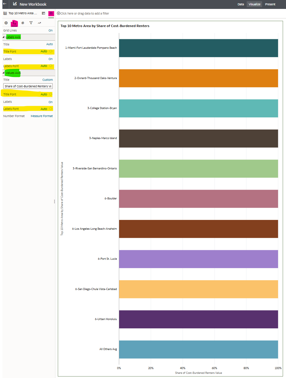 - Look under the Labels Axis (x-axis) and Values Axis (y-axis) (highlighted in green)
