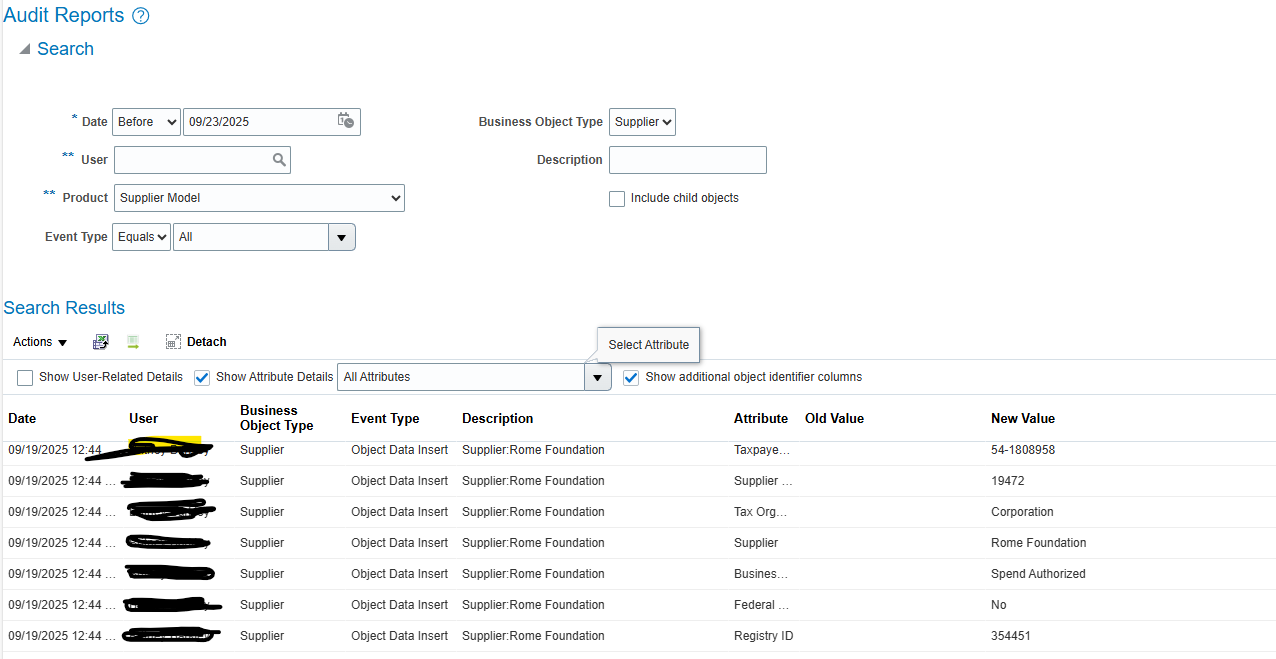 I am trying to find below attributes from the Tools- Audit reports from UI but not able to find the table and attributes for Supplier Audit report. Please advise!