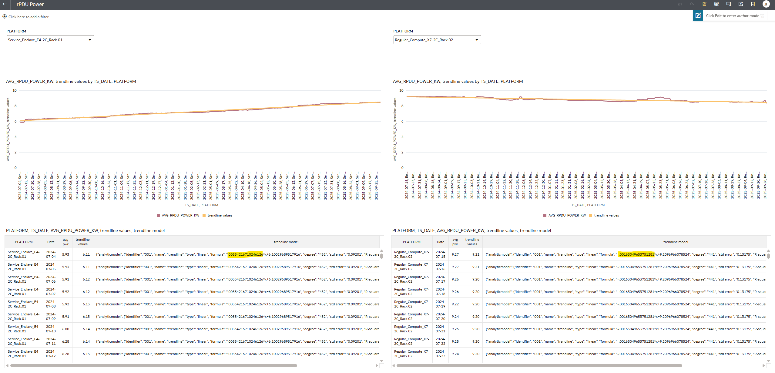 I have a data set of power values for many devices which are categorized in platforms. I want to understand at the platform level if the average power of its racks is increasing, decreasing, or staying the same.
