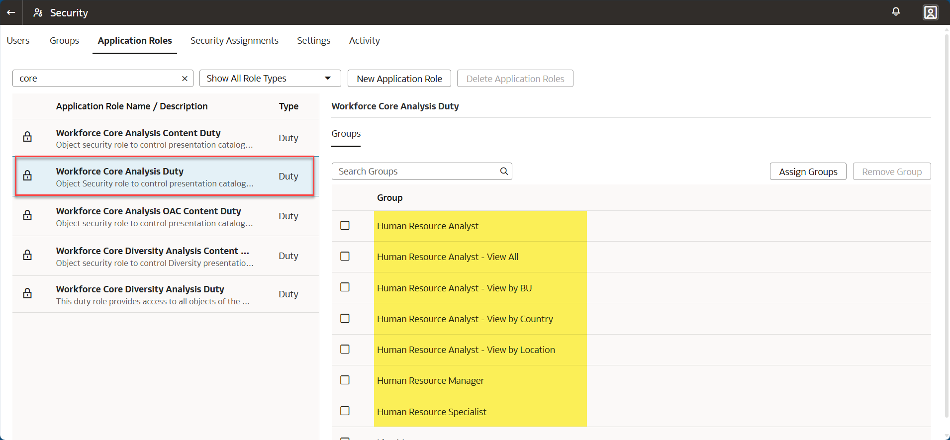 For instance, in the screenshot below the Workforce Core Analysis Duty (red box) is the Workforce Core information. In order to see that data a user must have the Human Resource Analyst, Human Resource Analyst - View All, etc (yellow box) in their HCM Security profile.