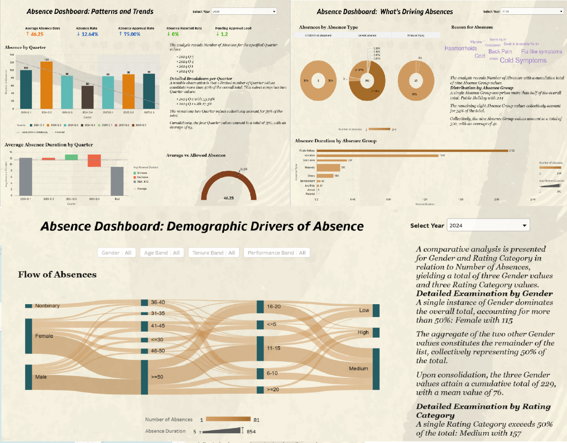 In this post, we are sharing a reusable workbook that highlights where employee absences are most concentrated and uncovers key absence trends across the organization. The dashboard provides a comprehensive view of absence patterns by location, job level, absence type, and time period. It also breaks down the underlying drivers of absences and visualizes critical metrics, such as average absence duration, approval rates, and top absence reasons.