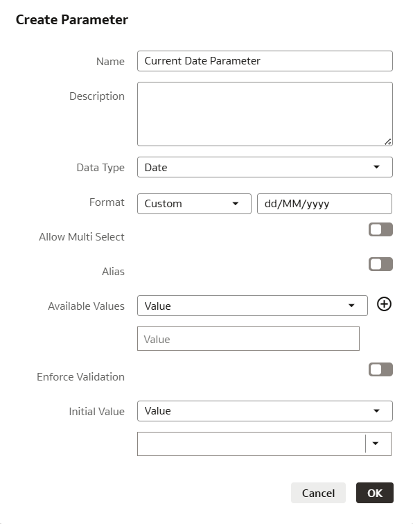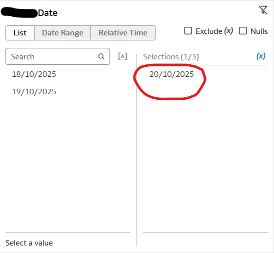Hii OAC Community. As shown below ,In some of our visualizations ,We have List Filter having Date values of Data type:Date and Format :dd/MM/yyyy .We want to make sure that the selection of Current Date is done automatically .For this we tried with Parameters ,but we couldn't found the current date value as shown below.Pls suggest if this the correct approach ? also how to resolve this .Thank you.